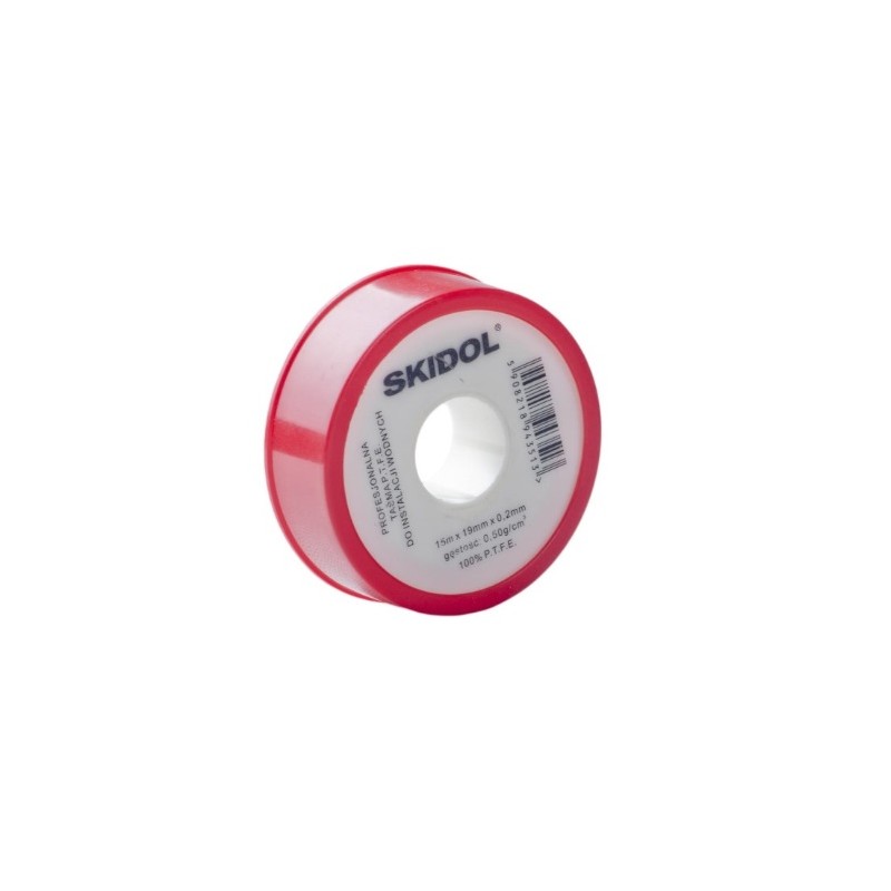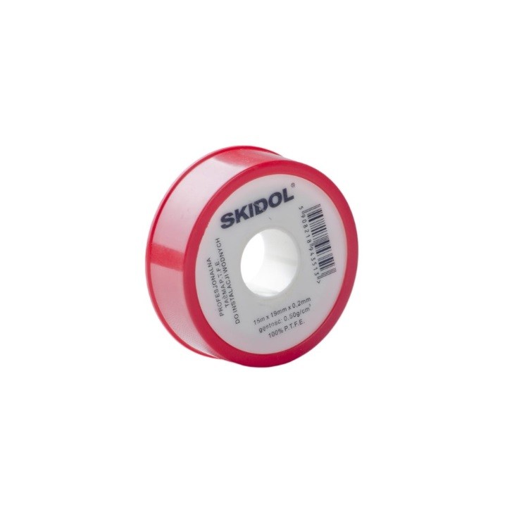 Profesjonalna duża taśma teflonowa firmy SKIDOL, do uszczelniania połączeń gwintowanych. Taśma P.T.F.E. może być stosowana podczas uszczelniania instalacji pneumatycznych i wodnych.