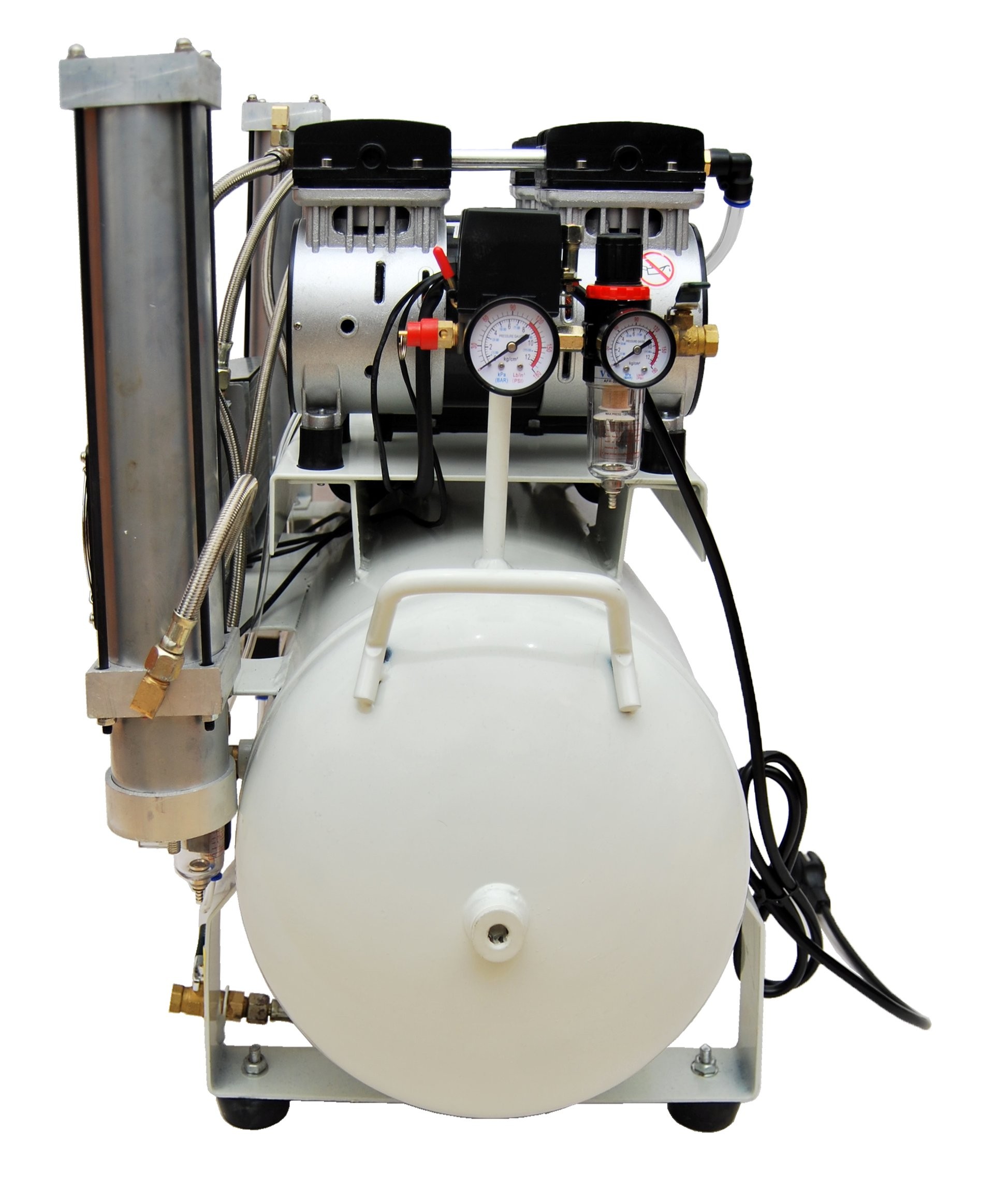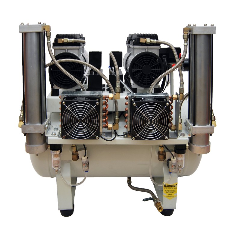 Profesjonalna bezolejowa tłokowa sprężarka z osuszaczem adsorbcyjnym. Przystosowana do pracy w laboratoriach, gabinetach medycznych, stomatologicznych i protetycznych. Niezastąpiona w miejscach w których wymagane jest źródło sprężonego, idealnie suchego i pozbawionego oleju powietrza. Dwie bezolejowe pompy zastosowane w kompresorze są niezwykle ciche i wydajne, a zastosowanie chłodnicy jeszcze bardziej poprawiła parametry całego urządzenia. Kompaktowa konstrukcja ze zintegrowanym osuszaczem czynią z niej idealne rozwiązanie dla gabinetów z małą ilością miejsca, a niski poziom hałasu (55 dB) pozwala na montaż bezpośrednio przy stanowisku pracy. Przyjazna w obsłudze, łatwa w serwisowaniu. Super wydajna i nowoczesna sprężarka, z emaliowanym od środka zbiornikiem, umożliwia podpięcie kilku unitów stomatologicznych, lub innych urządzeń wymagających niezwykle czystego i suchego powietrza. Najwyższej jakości materiały oraz sprawdzone komponenty czynią kompresor bardzo żywotnym i niezawodnym.