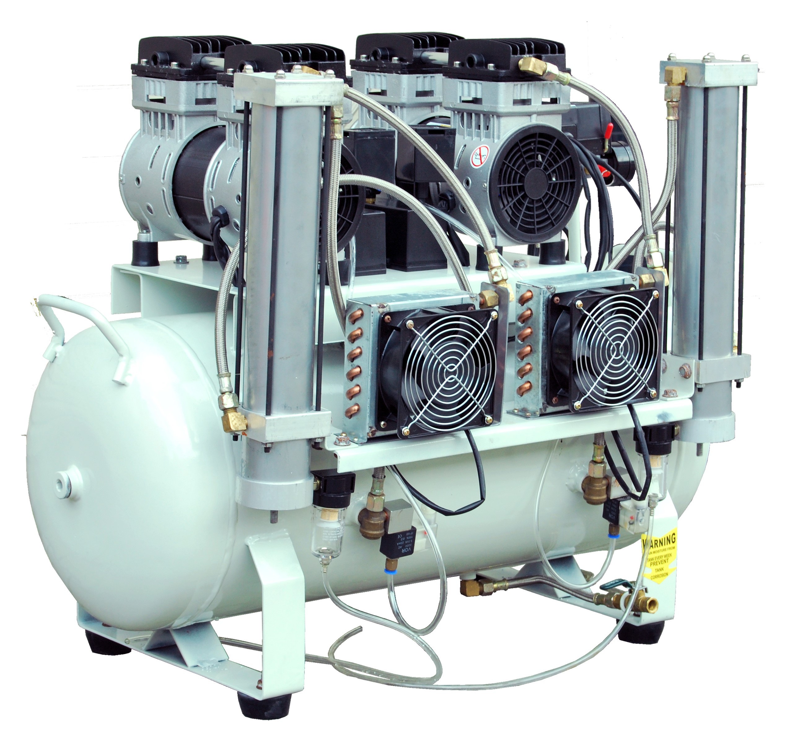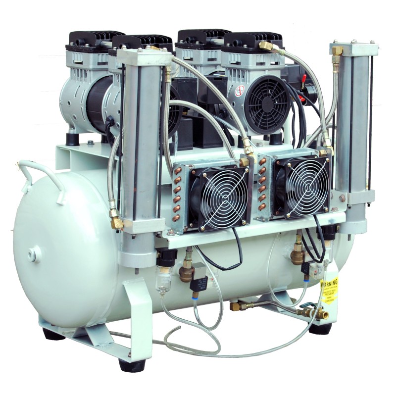Profesjonalna bezolejowa tłokowa sprężarka z osuszaczem adsorbcyjnym. Przystosowana do pracy w laboratoriach, gabinetach medycznych, stomatologicznych i protetycznych. Niezastąpiona w miejscach w których wymagane jest źródło sprężonego, idealnie suchego i pozbawionego oleju powietrza. Bezolejowa pompa zastosowana w kompresorze jest niezwykle cicha i sprawna, a zastosowanie chłodnicy jeszcze bardziej poprawiło jej parametry. Kompaktowa konstrukcja ze zintegrowanym osuszaczem czynią z niej idealne rozwiązanie dla gabinetów z małą ilością miejsca, a niski poziom hałasu (58 dB) pozwala na montaż bezpośrednio przy stanowisku pracy. Przyjazna w obsłudze, łatwa w serwisowaniu.