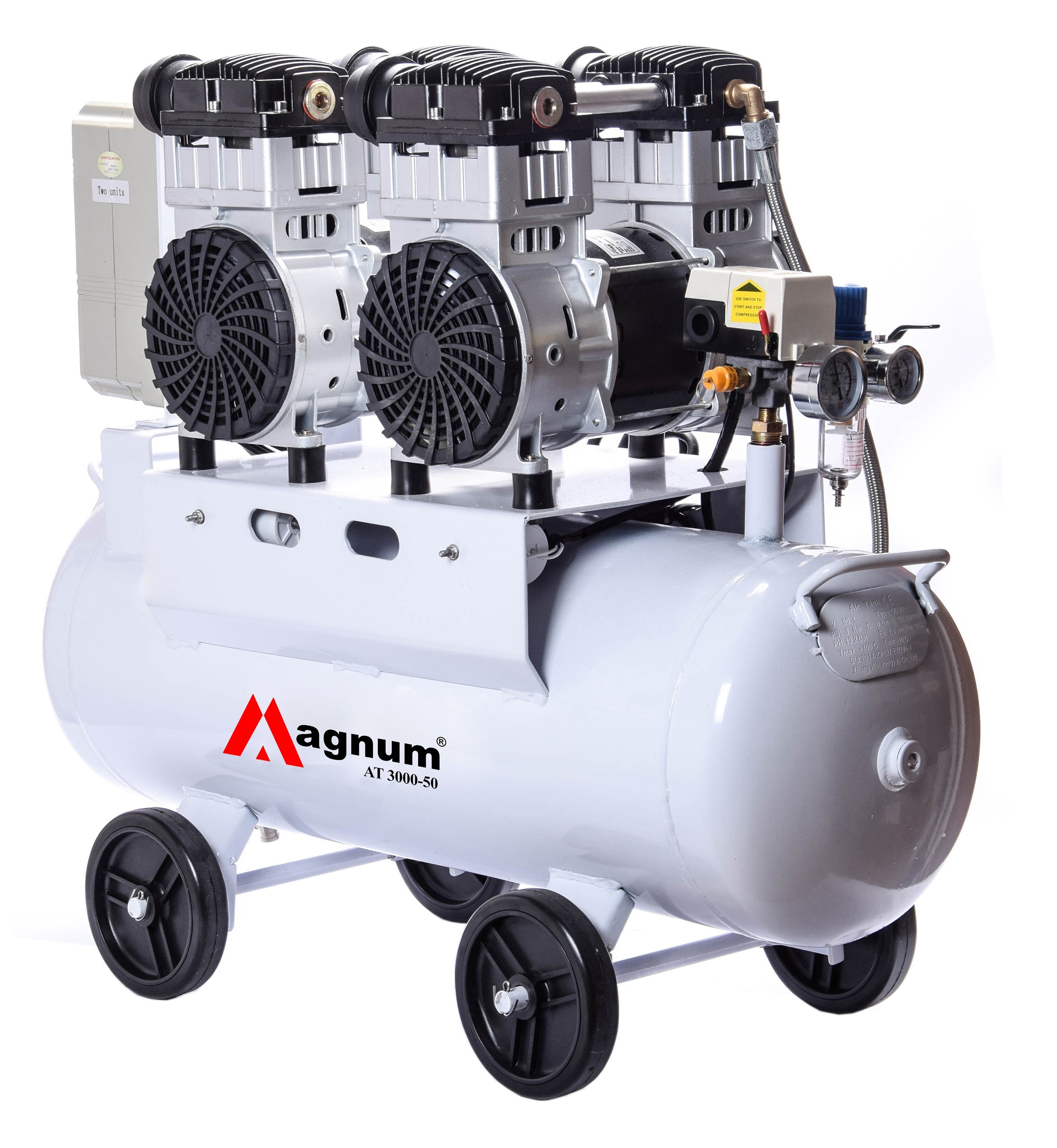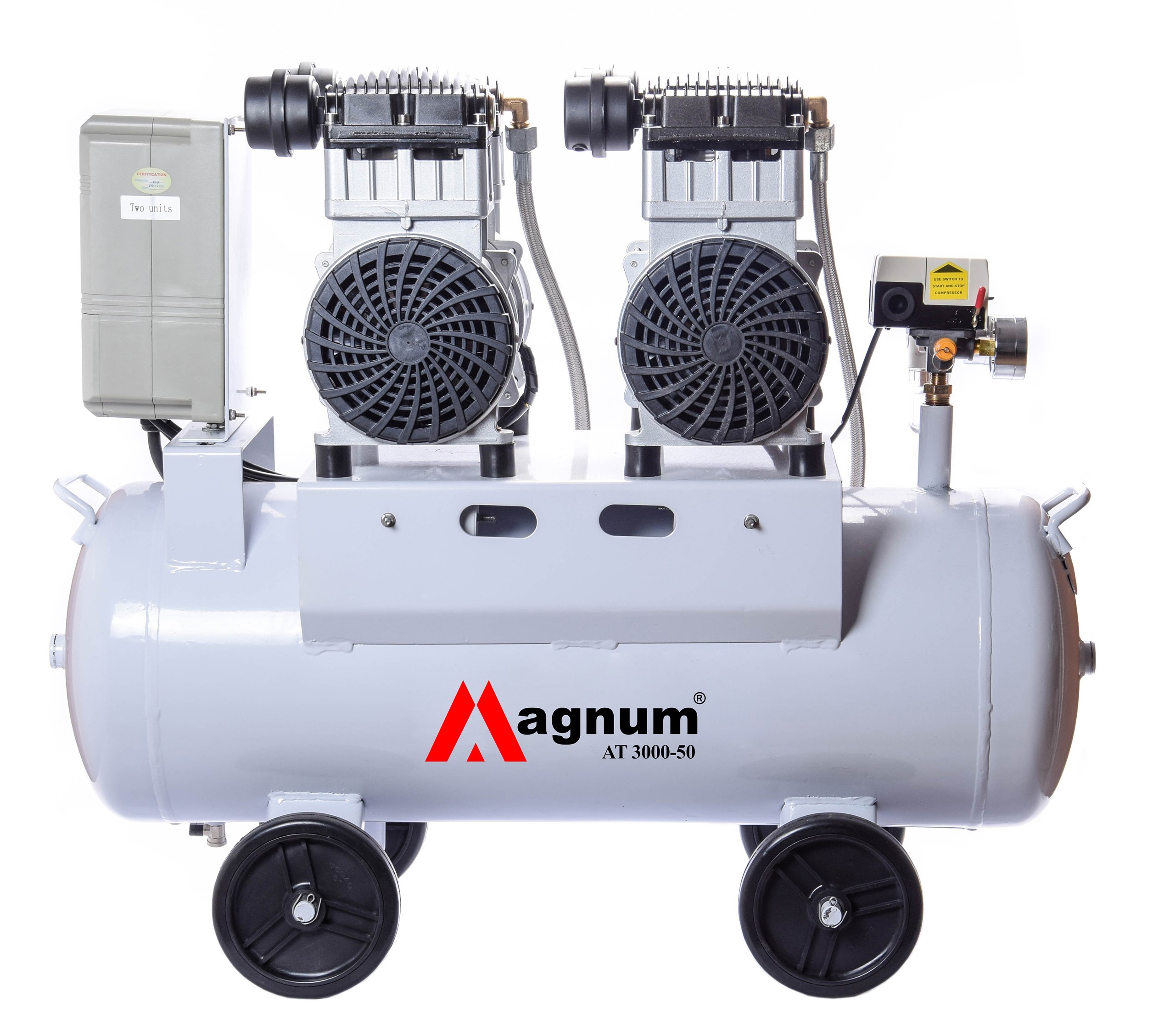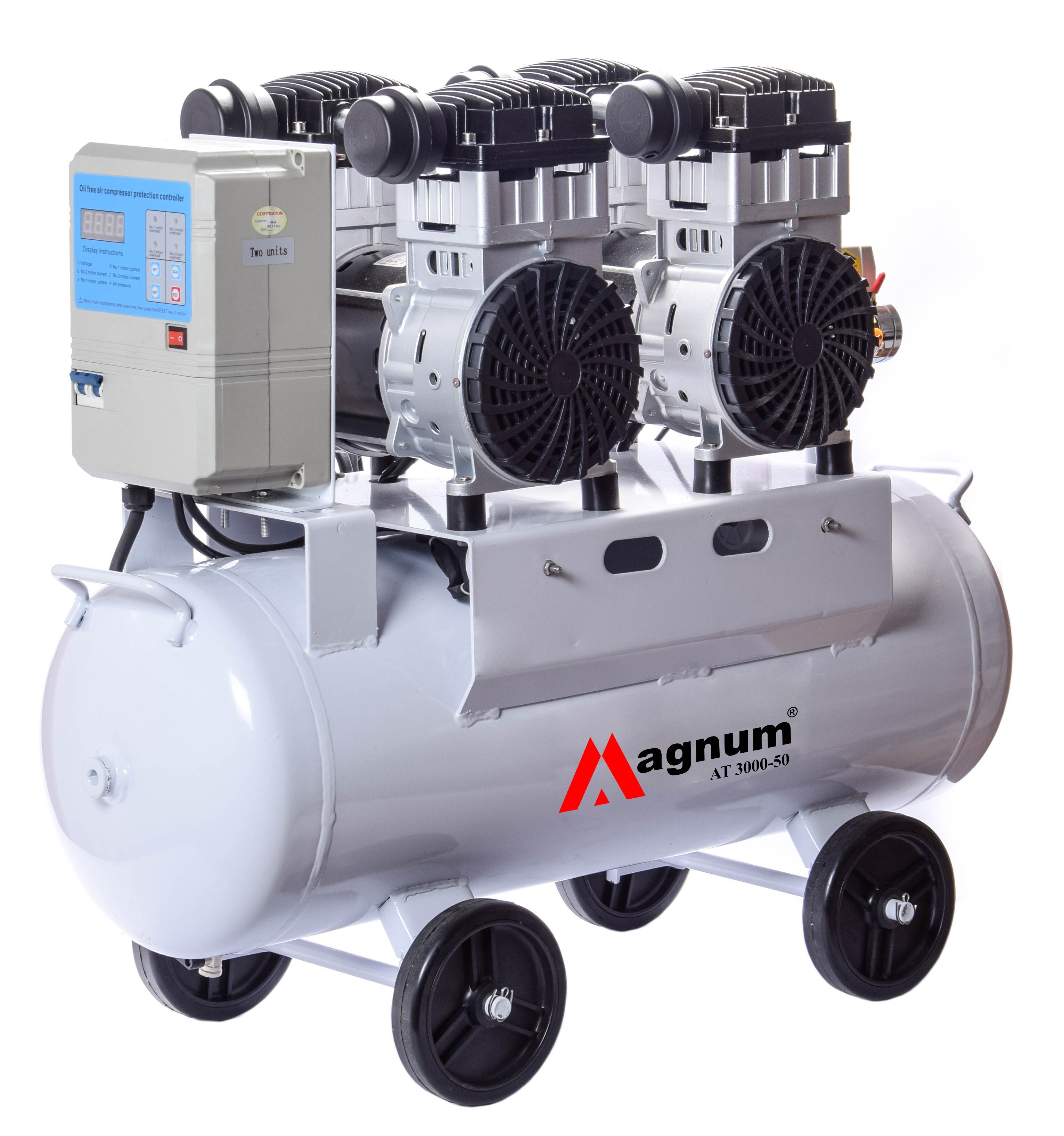 Kompresor MAGNUM to nowoczesne urządzenie wyposażone w dwie ciche a zarazem wydajne pompy bezolejowe. W sprężarce tej zamiast klasycznego wyłącznika ciśnieniowego zastosowano nowoczesny sterownik, odpowiadający za pracę pomp, dzięki czemu obniżono prąd rozruchu kompresora. Sprężarka przystosowana jest do pracy w laboratoriach, gabinetach medycznych, stomatologicznych i protetycznych: 50 litrowy zbiornik w połączeniu z pompami o łącznej mocy 3 kW pozwalają na zasilenie kilku stanowisk pracy.