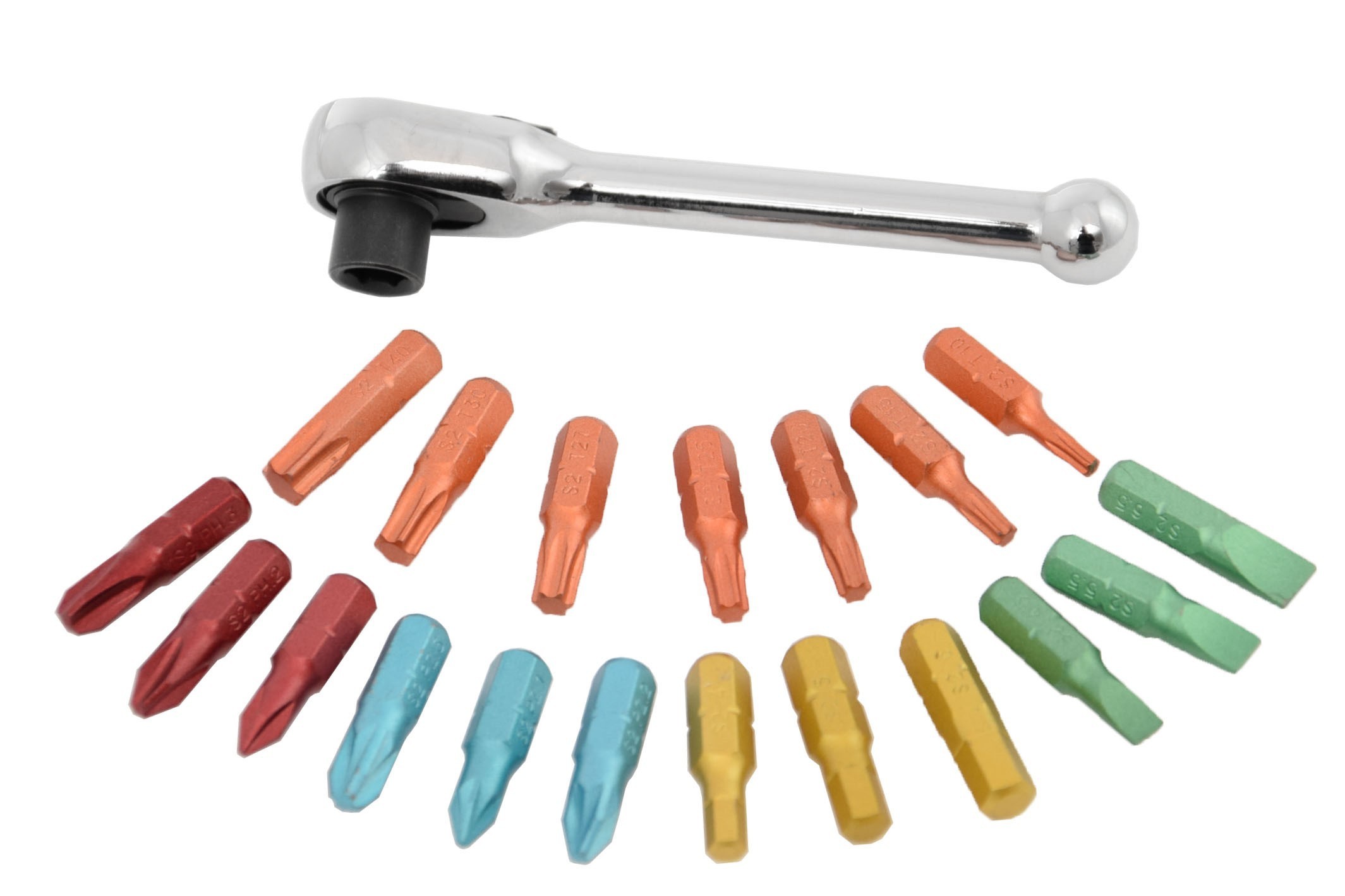 Profesjonalny zestaw bitów z grzechotką wykonany ze stali narzędziowej, to idealny wybór dla osób poszukujących mocnych i wytrzymałych narzędzi. Bity wykonane są ze stali S2 (73MoV5-2) utwardzanej powierzchniowo dzięki czemu osiągają twardość 64 HRC. Całość zamknięta w poręcznej, plastikowej kasetce.