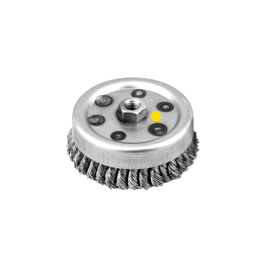 Szczotka stalowa splatana, doczołowa, nakręcana przeznaczona do szczotkowania dużych powierzchni.