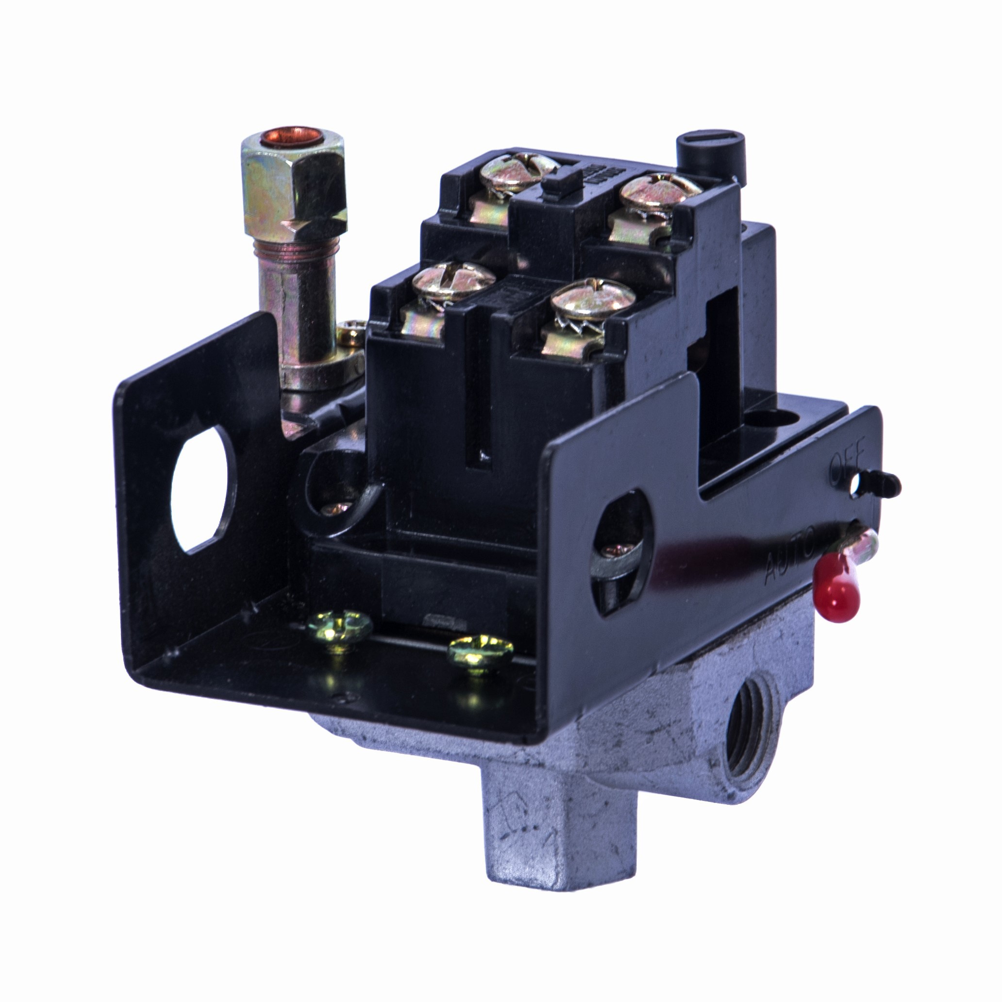 Presostat posiada cztery przyłącza wewnętrzne. Dolny gwint do zamocowania na zbiorniku kompresora i boczne gwinty do których można zamocować dodatkowe elementy według własnego zapotrzebowania - np. manometr, szybkozłącza, reduktor, zawór bezpieczeństwa.